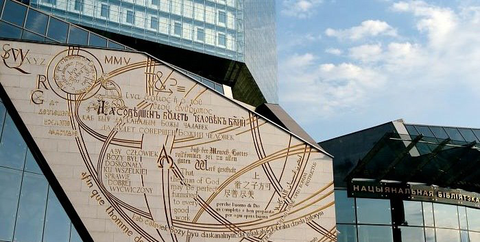 Con estas palabras escritas en varias leguas y expuestas en paneles pentagonales en forma de libro abierto, recibe la Biblioteca Nacional de Bielorrusia a quienes quieran interiorizarse en el saber almacenado entre sus paredes. También brinda homenaje a Francisk Skorina, humanista bielorruso representado por una escultura a la entrada de la biblioteca.