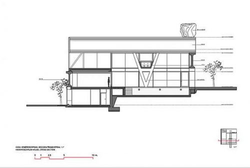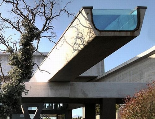 La larga piscina en viga hacia el aire del primer piso es una de las imágenes más fotografiadas de esta casa y vista desde abajo parece que vaya a precipitarse al jardín, como si se tratase de un vierteaguas gigante, produciendo cierto vértigo para el observador.