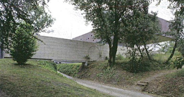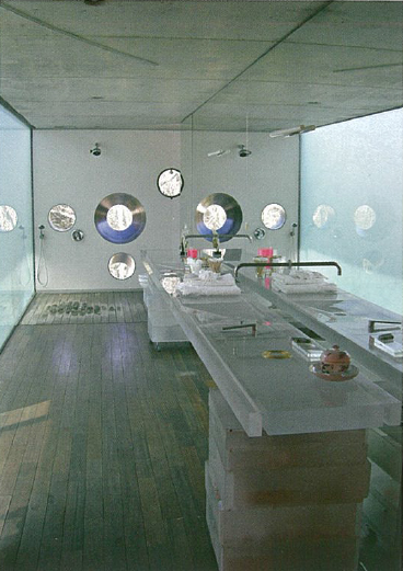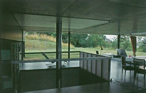 La planta intermedia de la villa, a nivel del campo, se coloca entre dos losas rectangulares con una altura de 2,4 m, rodeada por paneles de vidrio y aluminio. En el lado que da al césped un motor controla el movimiento los dos grandes paneles de vidrio que van desde el suelo hasta el techo, lo que permite una apertura completa. Este gran acristalamiento se corta por un armario bajo, de aluminio, que contiene las salidas de aire caliente y los altavoces, así como los acristalamientos fijos del estudio. Otras guías empotradas en la losa forman un sistema complejo, incluyendo interruptores ferroviarios, sistemas para mover las cortinas, tapicerías, cuadros, lámparas, puertas e incluso una jaula de palomas.