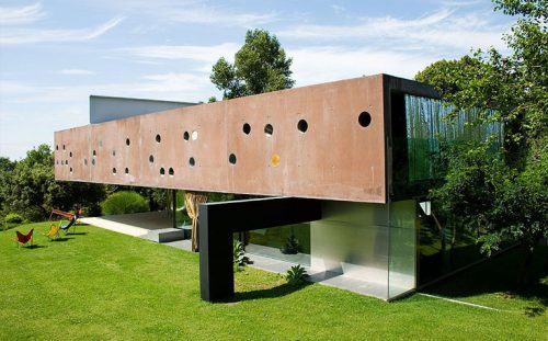 A no ser dos perfiles de acero en el sótano, no existen en esta construcción nada que se pueda llamar auténtico pilar, como tampoco muros de carga. Habitualmente las construcciones tienen bases sólidas y las partes de arriba más ligeras. En esta casa sucede todo lo contrario, la enorme caja de hormigón se apoya sobre un espacio abierto, aparentemente sin mayores apoyos y con paredes de cristal. Por lo general las vigas sostienen las cargas desde abajo, en este proyecto una enorme viga de acero, de casi un piso de altura, se apoya sobre el edificio como si fuera cualquier cosa, menos un miembro imprescindible de la estructura y así sucesivamente con todos los elementos o detalles de la construcción, como si se tratara de un juego manual.