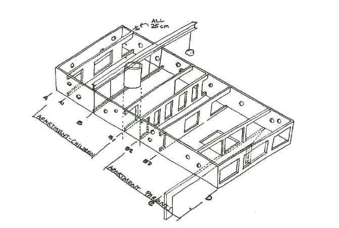El arquitecto propuso una casa, o en realidad tres casas, una sobre la otra. En ellas su propietario tendría su propio «espacio», o más bien «estación»: la plataforma elevadora. El movimiento del ascensor cambia continuamente la arquitectura de la casa. Una máquina es su corazón.