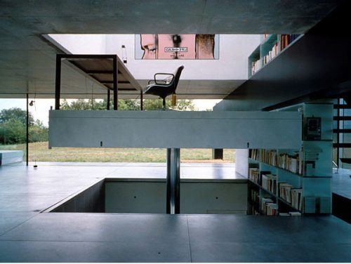 La inmaterialidad de la planta central hace que la planta superior de cemento quede como suspendida, levitando en el aire. La planta baja, aun estando en parte bajo tierra, no da la idea de cierre al interior, se abre como un patio transitable desde el que se accede a la entrada principal en el corazón de la vivienda, donde también están situados las conexiones verticales.