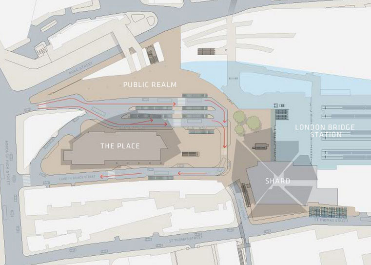 El edificio de usos mixtos, se ubica al lado de la Estación London Bridge, en la orilla sur del río Támesis. La estación que combina tren, autobús y metro es una de las más concurridas de Londres, Inglaterra, moviendo diariamente 200.000 viajeros.