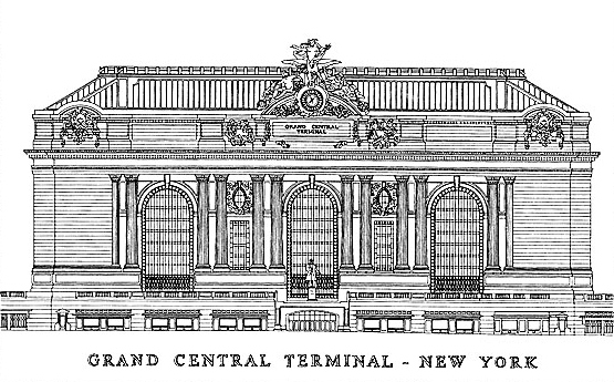La fachada sur de esta terminal es verdaderamente impresionante. En un frontón de casi quince metros, revestido con piedra caliza de Indiana, se encuentran las estatuas de Mercurio, dios del comercio, Minerva, diosa virgen de la sabiduría, la medicina y las artes, y Hércules, el legendario romano semidiós, mientras columnas corintias flanquean los arcos. La fachada fue diseñada por el arquitecto Whitney Warren en 1913, sin embargo, el grupo de estatuas fue esculpido por Jules-Alexis Coutain. En el centro de las estatuas destaca el reloj con cristales de Tiffany, con una circunferencia de 4 metros. Esta fachada, que sigue el modelo de un arco de triunfo romano, tiene 14,60 metros de alto y simboliza el triunfo de la vía férrea. También fue concebida como una puerta de entrada a la ciudad, situada, en 1903, principalmente al sur de la estación.