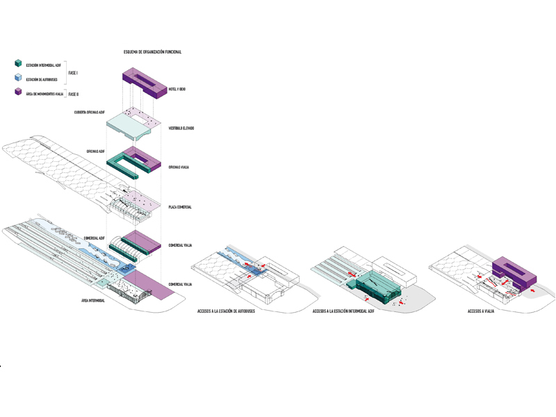 Este mismo principio se aplica a los volúmenes de nueva construcción. En lugar de crear una extensión grande de objetos, el volumen de la primera fase, estación de autobuses, centros comerciales y oficinas de ADIF, se encuentra en la parte superior y debajo del edificio actual, formando así un objeto nuevo y elegante ya desde los inicios. En la segunda fase un volumen expresivo, con una elegante plaza interna a nivel Sardineira se construirá al lado. Como un rompeolas urbano, el edificio de la estación ampliada recibe las ondas de los pasajeros.