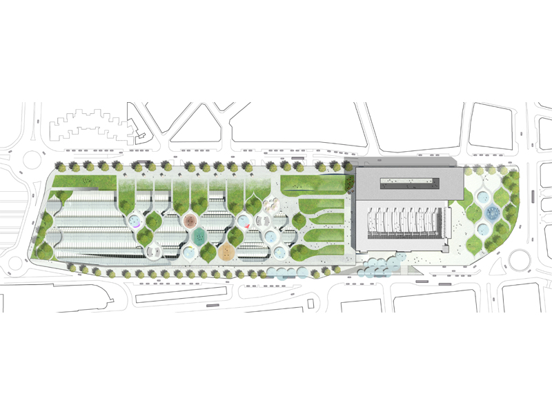 La sala central tendrá un ambiente animado, con los servicios de trenes y las instalaciones de venta al por menor añadidas. En la parte superior del tejado viejo se agregará uno nuevo, en todos los niveles las actividades se suman a la animación. La fachada principal se amplía y estará bien conectada con una plaza restructurada. En el primer piso, se añade un balcón.