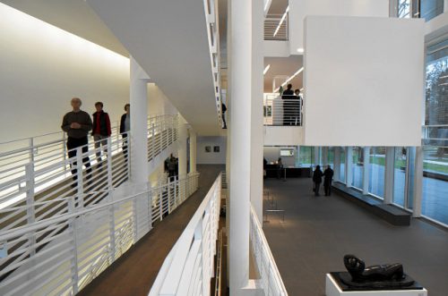 El edificio termina de descubrirse una vez dentro. Aquí pareciera tener efecto cada una de las decisiones tomadas a la hora de proyectar. Todo se encuentra en su ángulo preciso. Los paneles vidriados se superponen con los de aluminio blanco. Las rampas zigzaguean sutilmente a través del lobby. Las pinturas expuestas parecen majestuosas ante el reflejo de la luz.