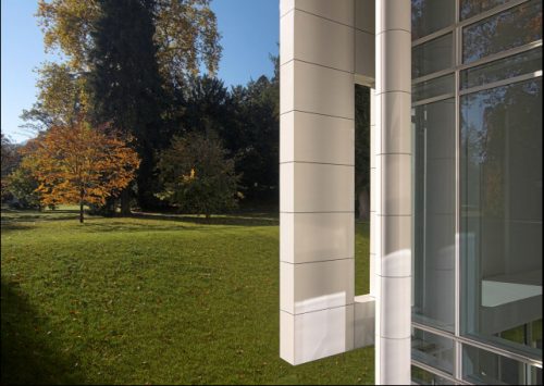 Las porciones traslucidas en el museo son de gran tamaño, como una segunda piel que envuelve al edificio. Los paños vidriados no solo permiten el ingreso de la luz natural, sino que también reflejan los árboles y el museo preexistente junto a él. Pero para evitar que las piezas de arte en su interior se dañen, así como que los visitantes se vean abrumados por tanta luz, utiliza parasoles metálicos horizontales, que regulan el ingreso de luz, y hacen que a cada hora del día el museo luzca distinto.