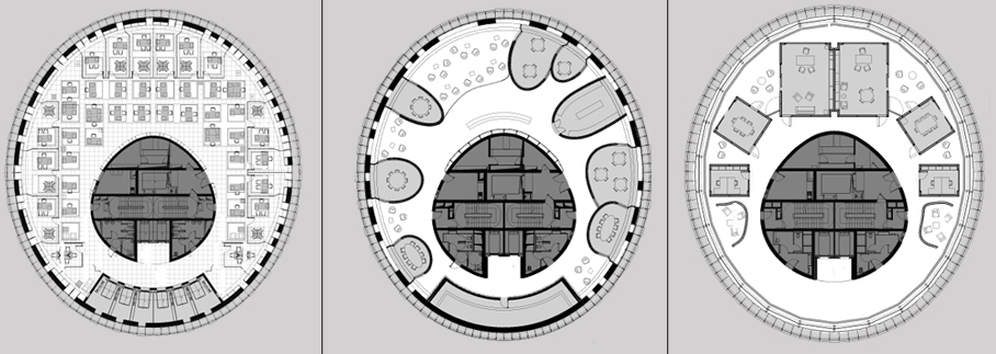 El cilindro interior de hormigón tiene un grosor de 45 cm en la base y 25 cm en la zona superior. El cilindro exterior, presenta grosores en base de 50 cm que se van reduciendo hasta 30 cm en la zona superior. El muro de hormigón correspondiente al perímetro exterior está perforado con 4.349 aperturas correspondientes a diferentes tipos de ventanas. Estos dos módulos se encuentran unidos entre si por vigas radiales de acero perforadas para aumentar la flexibilidad de los servicios.