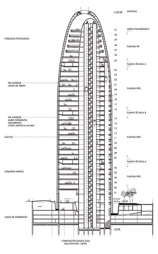 Estructuralmente, el edificio responde a un modelo de núcleo y perímetro exterior portantes que transmiten las cargas de unas plantas libres de apoyos intermedios. La torre está compuesta por dos módulos densos de hormigón, uno central y otro perimetral. Se trata de dos cilindros ovales, el central con forma ahuevada y el perimetral elíptico, no concéntricos y coronados por una cúpula de cristal y acero. La torre no es, de hecho, de planta circular, sino que ligeramente elíptica. Desde la planta baja hasta el piso 18 el edificio es totalmente recto, desde el piso 19 al 26 va disminuyendo paulatinamente la sección hasta el 26 donde se interrumpe el hormigón y continúa la cúpula de vidrio con estructura de metal. Las últimas 6 plantas, formadas por forjados postesados de hormigón, quedan suspendidas en voladizo.