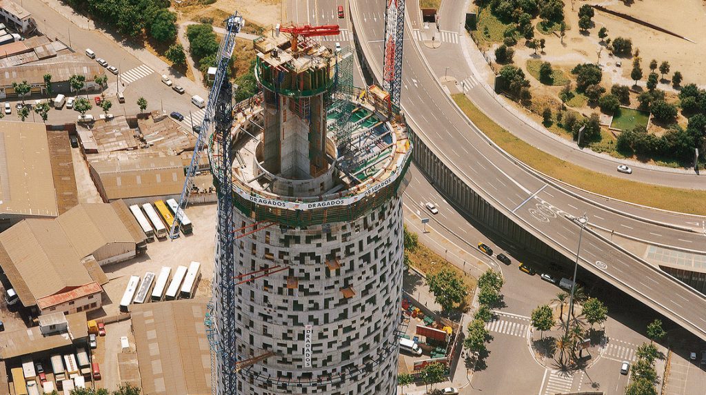 Su diseño combina diferentes conceptos arquitectónicos, obteniendo como resultado una estructura impresionante construida con hormigón armado, recubierta con una fachada de vidrio y con más de 4.500 huecos de ventanas recortadas en el hormigón estructural. En el momento de su finalización era el tercer edificio más alto de Barcelona, después del Hotel Arts y la Torre Mapfre, con 154 y 157m de altura respectivamente.