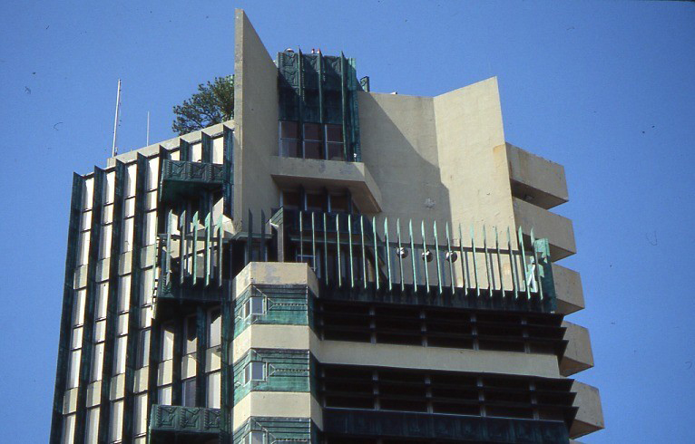 - La estructura de hormigón armado en voladizo parte de un núcleo central, con una fachada de hormigón y cobre. Los cristales de las ventanas exteriores están tintados en oro con marcos de aluminio.