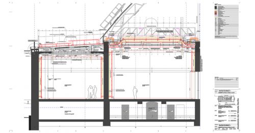 Una vez pasado uno de los ángulos del vestíbulo se inserta una torre de escaleras, contrapartida de la conservada escalera histórica conocida como la torre Ihne, el visitante es guiado a través de un corredor con un techo suave y liso de hormigón visto hasta un espectacular espacio cubierto con un techo de cristal anguloso e inclinado.
