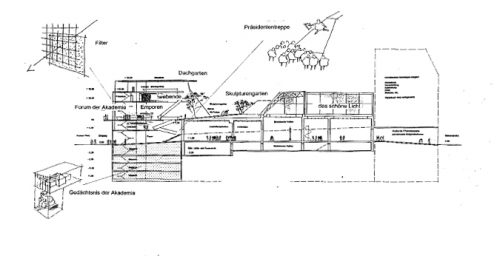En esta controvertida ubicación donde la filosofía de la reconstrucción mantiene sus más rígidas reglas y regulaciones es donde el nuevo edificio ha encontrado su expresión más clara, entre las fachadas de piedra del resto de los edificios de la plaza. El nuevo edificio de la Academia es una clara excepción, destacándose como un signo de exclamación que proclama la libertad de las artes.