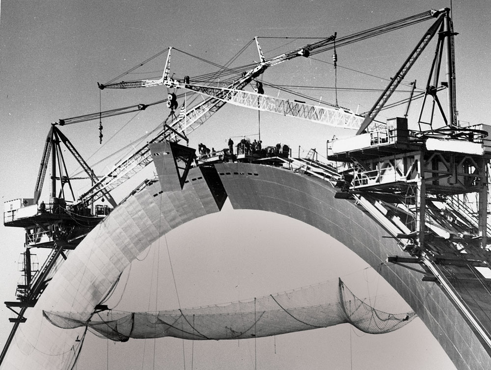 Ambas columnas del arco actuaron como voladizos independiente antes de la finalización y se levantaron al mismo tiempo sin andamios. Las primeras secciones triangulares, hasta una altura de 22m fueron manejadas con grúas sobre orugas que operan desde el suelo. Por encima de esta altura de dos torres de perforación trepadores, cada una con un peso de 100 toneladas, se utilizó para elevar a 3.66m de altura las restantes secciones de 50 toneladas.