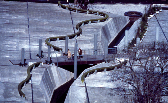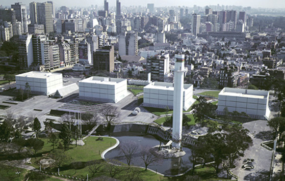 En el trazado del dibujo del jardín en pendiente, están superpuestos: la planta del antiguo diseño clásico del parque original, la repetición del módulo cuadrado de la trama interior y un conjunto de elementos que enmarcan vistas y recogen líneas urbanas principales que desde arriba se hacen notablemente más importantes. Hay también, en la columnata que conduce al público hasta la entrada del estudio mayor, una alegoría monumental en homenaje a los hombres del espectáculo nacional. Los cuatro volúmenes de hormigón armado a la vista de los estudios, emergen de la plaza seca separándose del piso y llegan a 20 metros de altura.