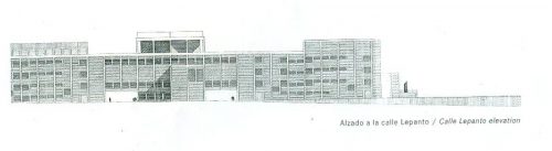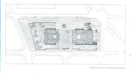 Moneo recupera un diseño de Ildefons Cerdà, el creador del Eixample barcelonés, la manzana 2×1 de forma rectangular, similar a la manzana de la Universidad de Barcelona, en la plaza Universitat, o a la del Hospital Clínic de Barcelona.