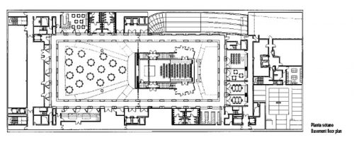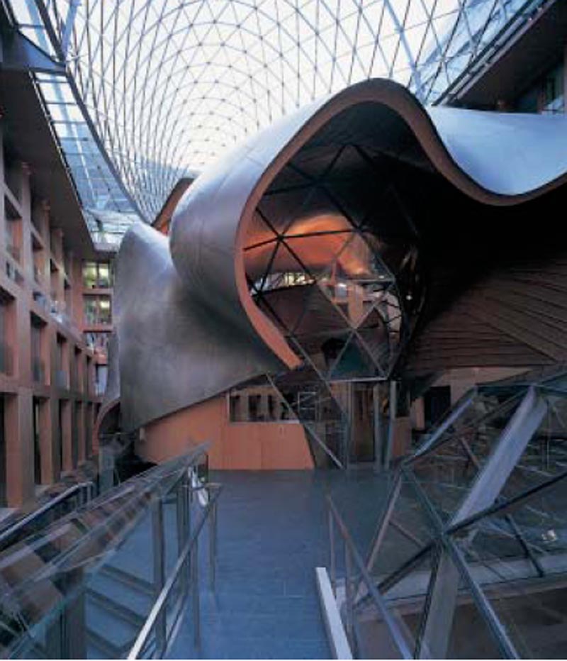 El Gehry ‘tradicional’ se produce, pues, en el área de la entrada, como una curiosa solución al requerimiento de espacio de reunión y conferencias para el edificio