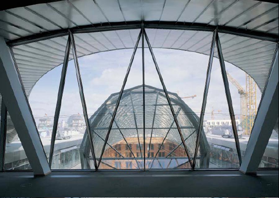 La estructura de forma-libre del auditorio de conferencias fue el trabajo más complicado de todos, completamente realizada en estructura de tipo frame. Esta increíble y original pieza tiene 29 metros de largo, 12 metros de profundidad y 10 metros de alto. La concha “shell” formada por dos piezas iguales (mitades) es la estructura donde se apoya el anillo de hormigón armado que sujeta las complicadas coberturas de vidrio y los puentes.