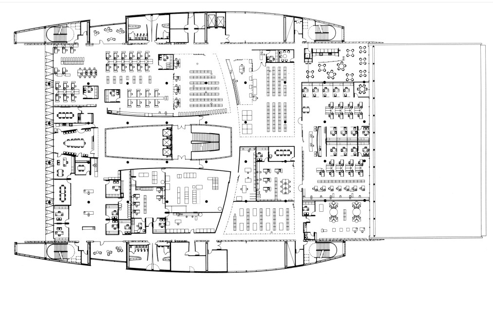 La huella de la biblioteca tiene un enfoque sencillo ortogonal basado en tramos cuadrados de 32′-8 «, una medida derivada del apilamiento de los módulos de la biblioteca. Estas bahías abarcar el espacio del atrio central, que contiene ascensores totalmente acristalados y una gran escalera que se levantan desde un espejo de agua en el plano del suelo. Un monitor de acero inoxidable con nueve claraboyas de seguimiento en la corona de la aurícula baña a los ocupantes con un juego animado de luz durante todo el día.