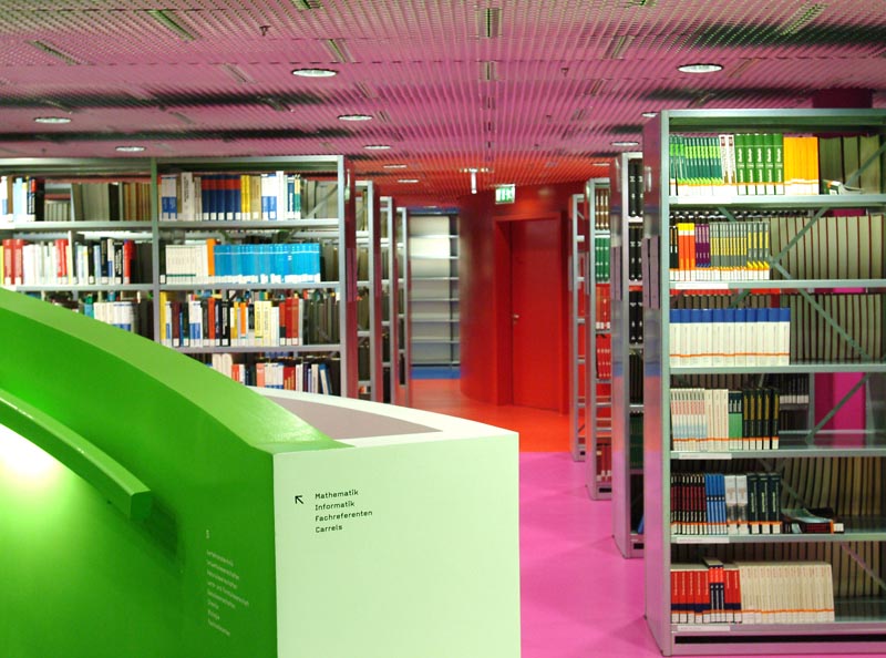 Los problemas de la arquitectura suelen ser el espacio, la luz y las vistas. Las áreas en el interior del edificio, donde se almacenan los libros y otros medios de comunicación, se bañan en color. Los colores del espectro se han pintado en franjas en los suelos, soportes y muros, siguiendo un sistema ortogonal racional. También ayudan a la orientación, pero sin un código definido de color para los diferentes campos de estudio en el edificio, turnándose el verde con rosa, azul, amarillo y magenta. Los colores se reflejan en los techos metálicos, estantes y paredes divisorias hechas de metal desplegado, creando un efecto casi psicodélico.