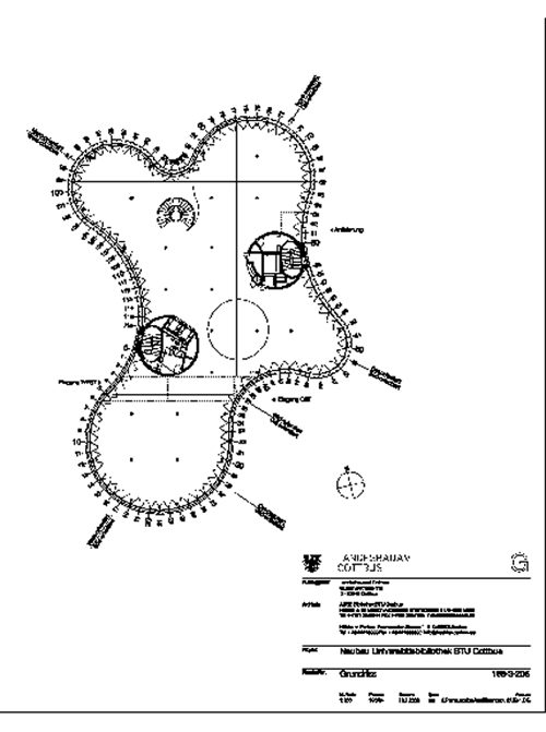 En la propuesta de los arquitectos Herzog & de Meuron, presentada en 1993, se sugirió la colocación de dos edificios rectangulares en la zona situada al oeste de la ciudad universitaria, uno albergaría la biblioteca y el otro sería el auditorio principal de la universidad. Estas áreas de la universidad, también utilizadas por la población de Cottbus, se convertirían en parte de la ciudad. Pero cuando el proyecto fue retomado, en 1998, el auditorio principal ya se había alojado en otro lugar dentro del campus.