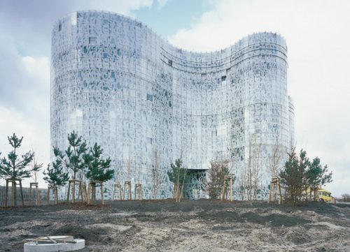 Un velo blanco se imprime en ambos lados de la cáscara de cristal del edificio. Textos en diferentes idiomas y alfabetos se han superpuesto en tantas capas que ya no son legibles, pero crearon un patrón de resultados cuyo origen en el mundo de los signos escritos es inconfundible. El patrón impreso rompe el reflejo, elimina la dureza del vidrio y hace homogéneo el cuerpo del edificio.