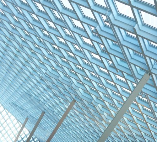 El segundo sistema, la rejilla de acero en forma de diamante, forma el exoesqueleto del edificio. La rejilla de acero proporciona el sistema lateral del edificio, interconecta las cerchas de las plataformas, sirve de acabado arquitectónico de interiores, y soporta la cortina de vidrio que recubre la construcción.