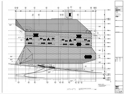 El exoesqueleto fue diseñado de modo que se pudieran usar cuadrículas de acero comunes, cuyo tamaño W12x22, pudieran ser intercaladas en las estructuras. La forma y tamaño de diamante fueron optimizados a 10.16cm por lado y una altura de base de 17.78cm según las placas de vidrio plano del mercado, buscando la fabricación más eficiente y tratando de eliminar la necesidad de montantes secundarios. La utilización de piezas estandar facilitó la prefabricación de la parrilla de acero estructural en escalas de hasta 2.16m de altura, simplificando en gran medida la construcción.