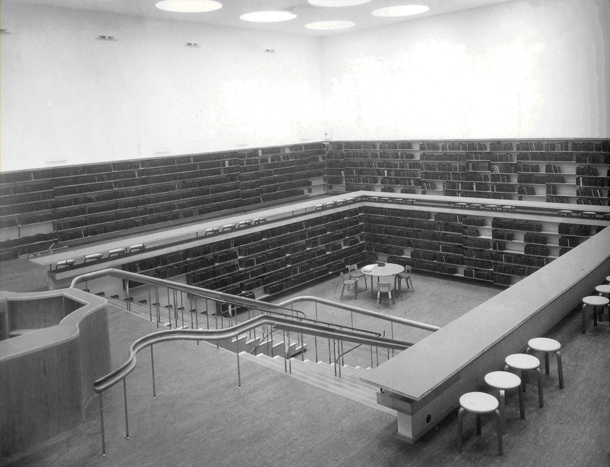 Las salas principales de lectura y préstamo de libros, superpuestas ingeniosamente, crean en sección un espacio nuevo y continuo. A la izquierda de la sala principal una escalera flanqueada por dos cristales comunica con el ala administrativa.