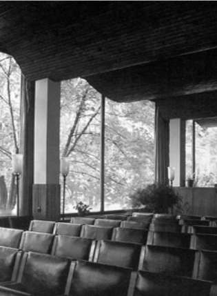 Son particularmente características las ondulaciones del techo de la sala de conferencias, formado con listones de madera y pensado para propagar de una manera más eficiente el sonido a cada rincón de la sala. El conocimiento y experiencia del arquitecto con la madera a través de sus diseños para mobiliario le permitieron desarrollar aquí el salto en el uso de este material en la propia arquitectura, con sus característicos taburetes apilables y sillas con respaldo. Lamentablemente este techo de madera ondulada fue eliminado por los rusos.