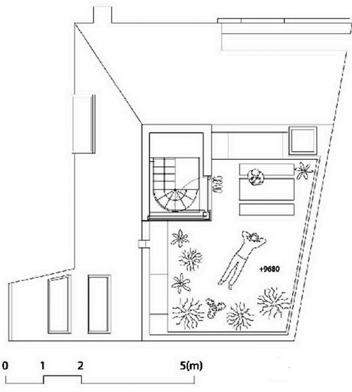 La superficie de los descansos de la escalera van desde 3 a 10 m2, y el estilo de las escaleras varía para darle a cada espacio un grado distinto de privacidad.