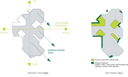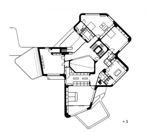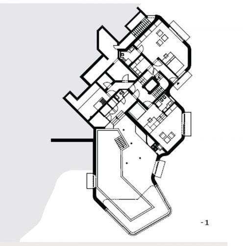 En la última planta las protuberancias de los dormitorios nacen desde el corazón de la casa. En esta planta las ventanas están en ángulo para mostrar los puntos de vista concretos de los edificios y el paisaje circundante.