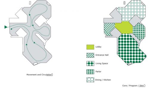 Logrando que el edificio anterior, se amplíe en un esquema asombroso y excepcional, creando una atmósfera de serenidad y de lujo, sin dejar de recordar las casas que aún hoy en día en muchos países se amplían al mismo ritmo que lo hace la familia, reticente a abandonar la casa familiar y muy por el contrario con tendencia a incorporar las nuevas familias en la misma vivienda.