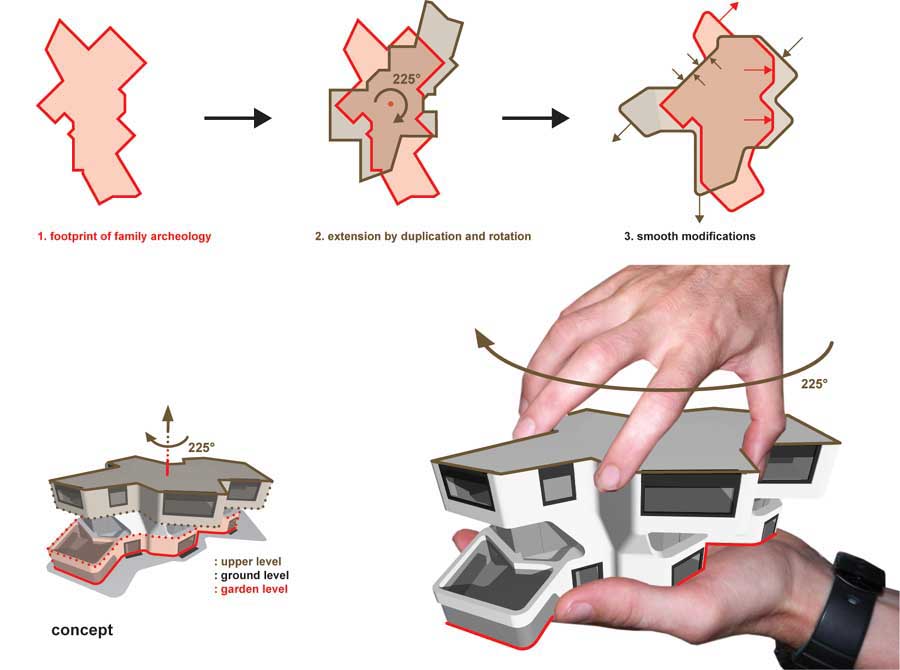 Esta obra tiene la clara huella arqueológica de los antecedentes familiares de los Cleint, dicha «huella» es el punto inicial del diseño para este nuevo chalet. Con la anterior estructura que se amplía en un esquema inesperado y extraordinario, el arquitecto analiza las dos historias en un perfil que se duplica, se levanta y se tuerce hacia el nivel del jardín en un movimiento ondulante.