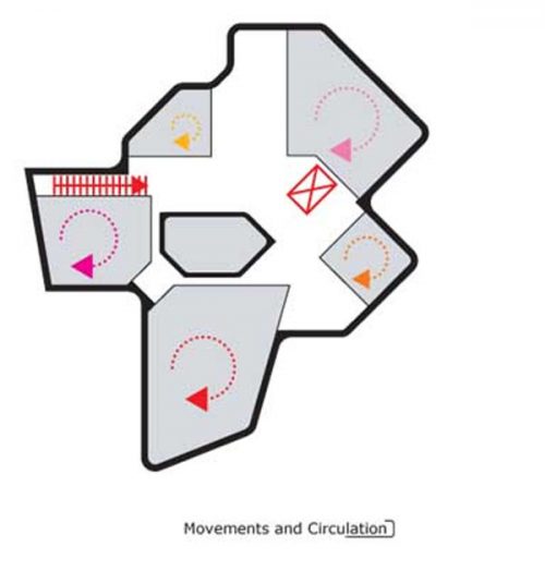 La construcción de la planta media se trata como un espacio público, con un gran atrio en el vestíbulo y grandes ventanas panorámicas que crean una sensación de espectáculo. Tanto el exterior como el interior se ven muy modernos, incluso con un estilo futurista.