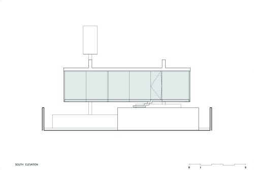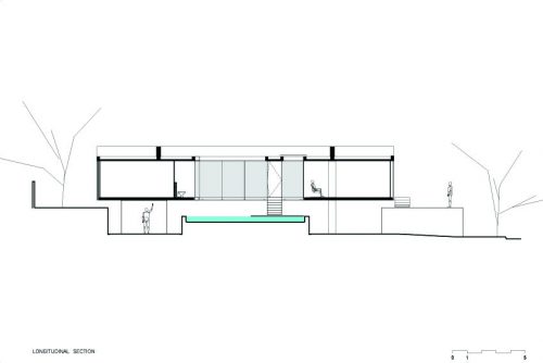 En la segunda más baja, 1,2 metros sobre nivel calle, se ubica la escalera de acceso a la vivienda y la cocina. Esta zona, protegida por amplias cristaleras, sirve como lugar de transición entre los dos volúmenes y disfruta, en el exterior, de los pequeños espacios verticales obtenidos por la solución estructural y de la piscina ubicada en el jardín.