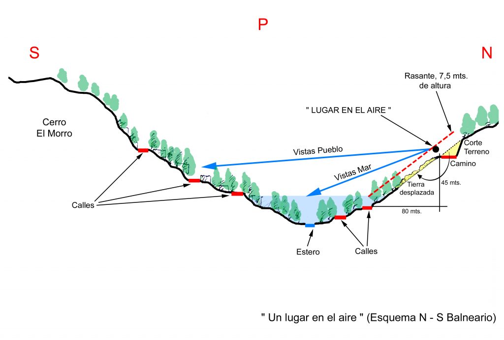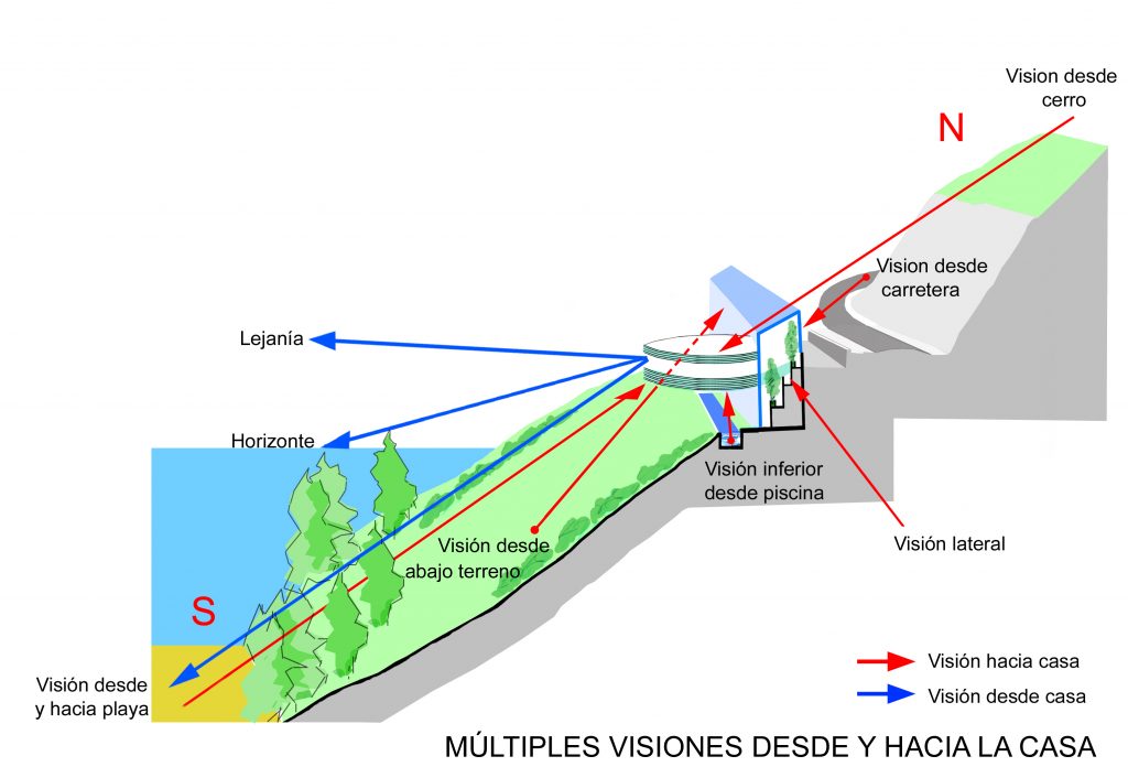 Además los reglamentos obligaban a construir bajo una rasante de 7,5 mts. Estas condiciones llevaron a ubicar la casa lo más alto y cerca posible de la Ruta superior y al lado oriente, en busca del sol y las vistas.