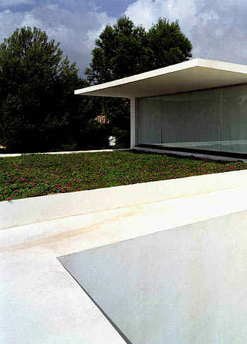 Desde el exterior no se ve. La casa abstracta está perdida en el lugar. Al acercarse a ella las cosas van cambiando, el asfalto de la calle se convierte en un pavimento de escamas de granito entre las que crece la hierba. Escondido detrás de un árbol se descubre un hueco en el muro blanco que da a un patio en el que hay una puerta. Una vez atravesado ese dintel nos damos cuenta de que aunque estamos a cubierto hemos entrado en un jardín secreto y cerrado. El anfitrión me recibe mientras que a nuestra derecha un perro nos mira, detrás de la línea donde se acaba el mármol blanco macael de enormes dimensiones y empieza el césped. Nos separa un cristal.