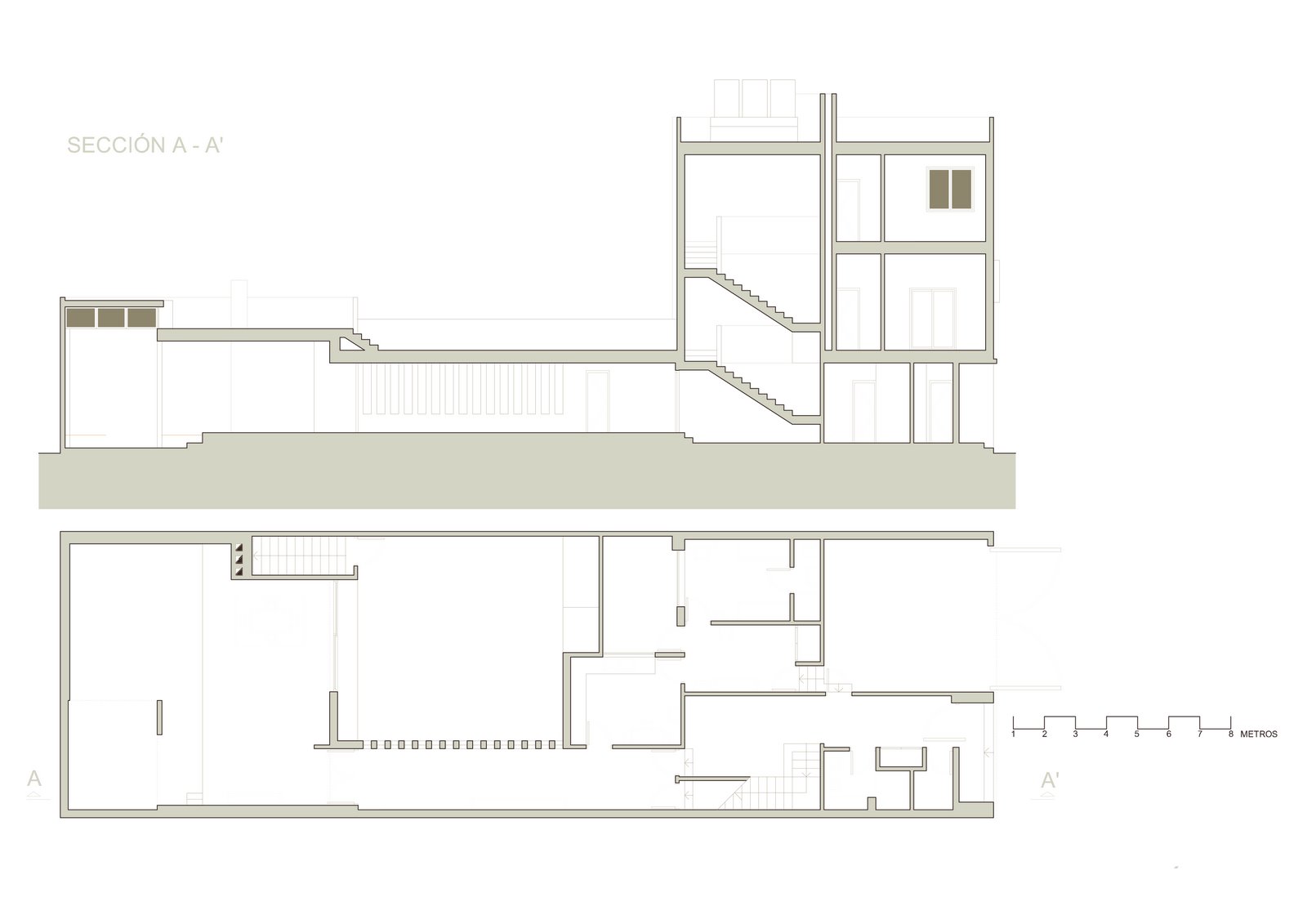 Por ser una casa entre medianeras se optó por una estructura tradicional de muros portantes, disponiendo los locales en una cuadricula, subdividiéndola según la proporción de cada ambiente. Los muros de carga son recortados en la fachada principal por moderadas aperturas hacia la calle. Una substracción en la segunda planta genera una terraza limitada por muros altos que protege de la calle los ambientes que ahí se ubican.