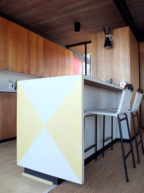 Las plataformas de la casa son de madera deck. En la plataforma más pequeña, una puerta de madera pintada en color rojo da acceso a las escaleras que descienden a la arena, mientras que otra pintada en color naranja con una cristalera en el lateral cierra la cocina.
