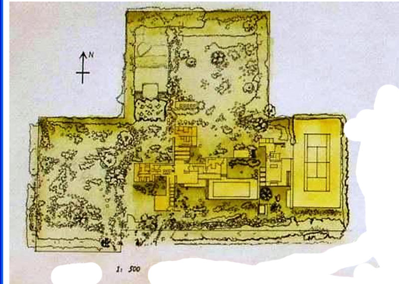 El jardín penetra casi inadvertidamente, con suaves oscilaciones, en toda la casa, dispuesta en ángulo recto aunque pese a la suavidad de sus formas aún hoy los vientos del noreste de Palm Spring son implacables y a pesar de las mejoras, de las persianas y de las paredes sólidas, arrastran hasta el interior de la casa todo lo que encuentran.
