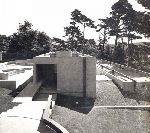 Emplazada en la ladera de una montaña densamente arbolada, la Casa Koshino está empotrada en el terreno, cuya configuración irregular contrasta vigorosamente con la nitidez de las formas geométricas de la edificación.