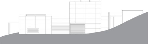 En el bloque central dedicado a la vivienda y con dos plantas la entrada se realiza por una zona con altos forjados para desde aquí pasar a la sala de estar con doble altura. Las dos grandes aberturas de la sala ofrecen vista a las vertientes abruptas, los árboles y las colinas en la distancia.