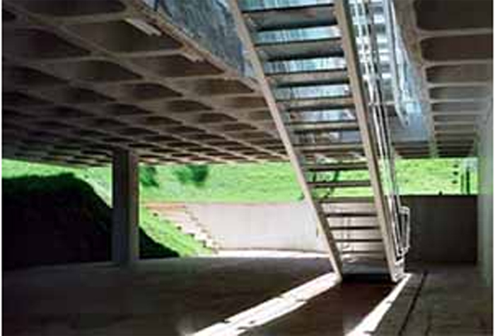 La repetición geométrica, con riesgo de convertirse en obsesiva, sutilmente es contradicha por una serie de decisiones disonantes, que regulan la utilización y la visual.