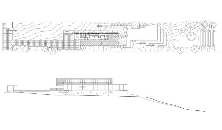 El programa se desarrolla en dos volúmenes flotantes y un zócalo semienterrado.