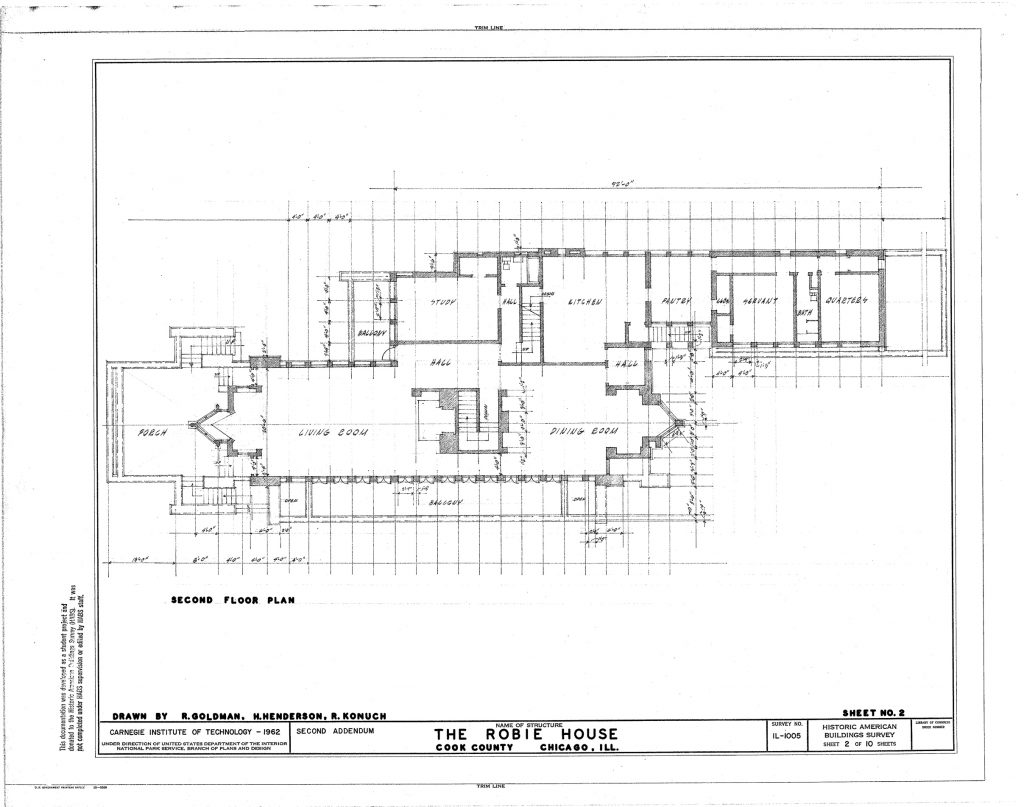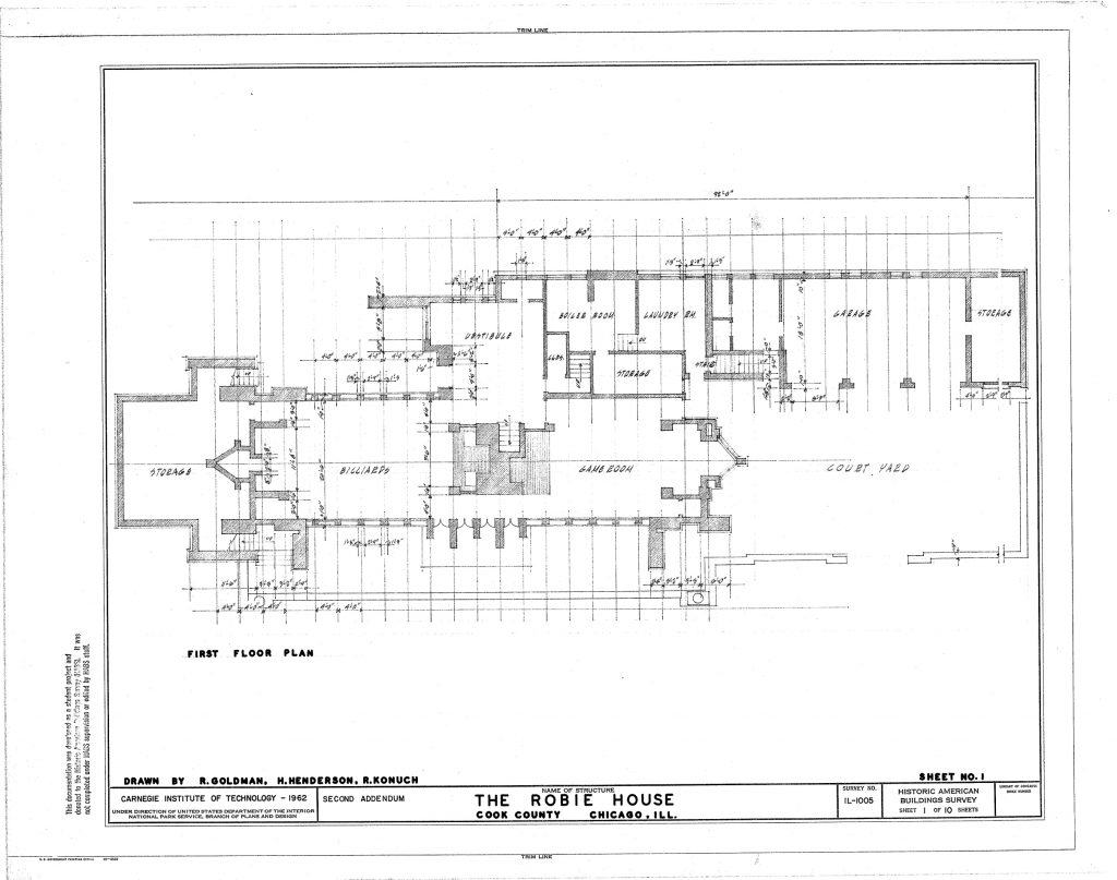 Deseaba una casa protegida contra incendios sin espacios cerrados en forma de “bloques” y sin los elementos decorativos habituales, como cortinas o alfombras compradas, etc. Como ingeniero, Frederick C. Robie, quería además una casa que funcionara como una buena máquina. La situación en un ángulo del terreno explica en gran parte su forma, muy similar a la de otras “Prairie Houses”.