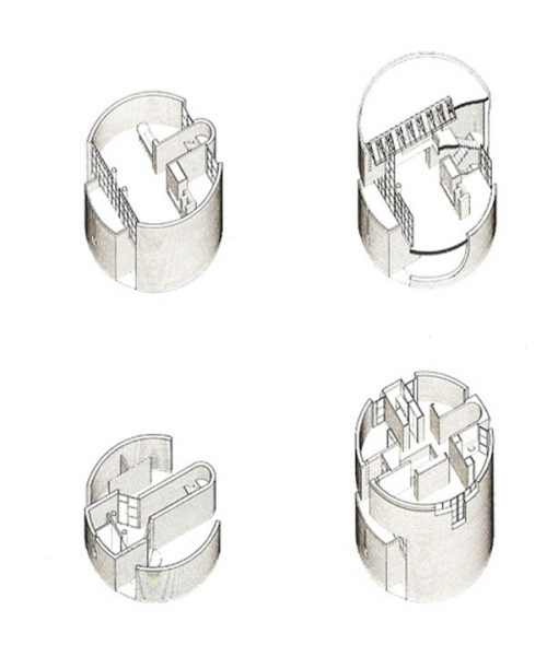 Una vez escogido el cilindro como forma, solo queda desarrollarlo y hacerlo habitable, tarea que resulta complicada pues cualquier añadido echaría a perder la forma pura. La salida a la que recurrió Botta fue la sustracción, vaciando el espacio y las aberturas para iluminarlo.