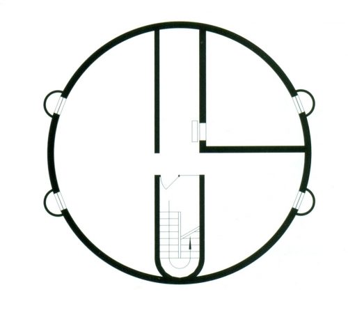 «Me imaginaba un edificio de planta circular, atravesada en su eje norte-sur por una fisura por la que desciende luz cenital. Un volumen organizado en tres niveles, una especie de torre, o más bien, un objeto diseñando y cortado a si mismo. La intención era evitar cualquier comparación y/o contraste con los edificios circundantes, pero buscando una relación espacial con el paisaje lejano y el horizonte. Mediante la utilización de un volumen cilíndrico quería evitar elevaciones, que necesariamente, serían comparadas con las fachadas de las casas existentes en los alrededores.