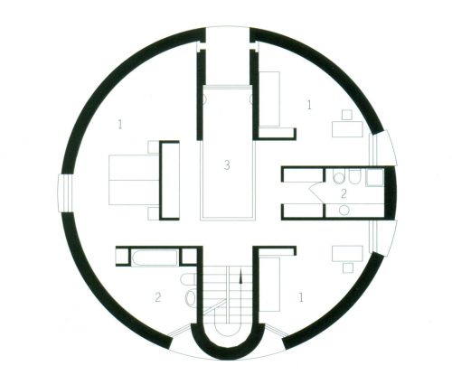La sala de estar y el estudio se ubican a un lado de la abertura y el comedor y la cocina al otro. El comedor y la sala de estar tienen acceso al mismo balcón que continúa la forma del cilindro.